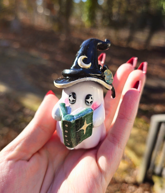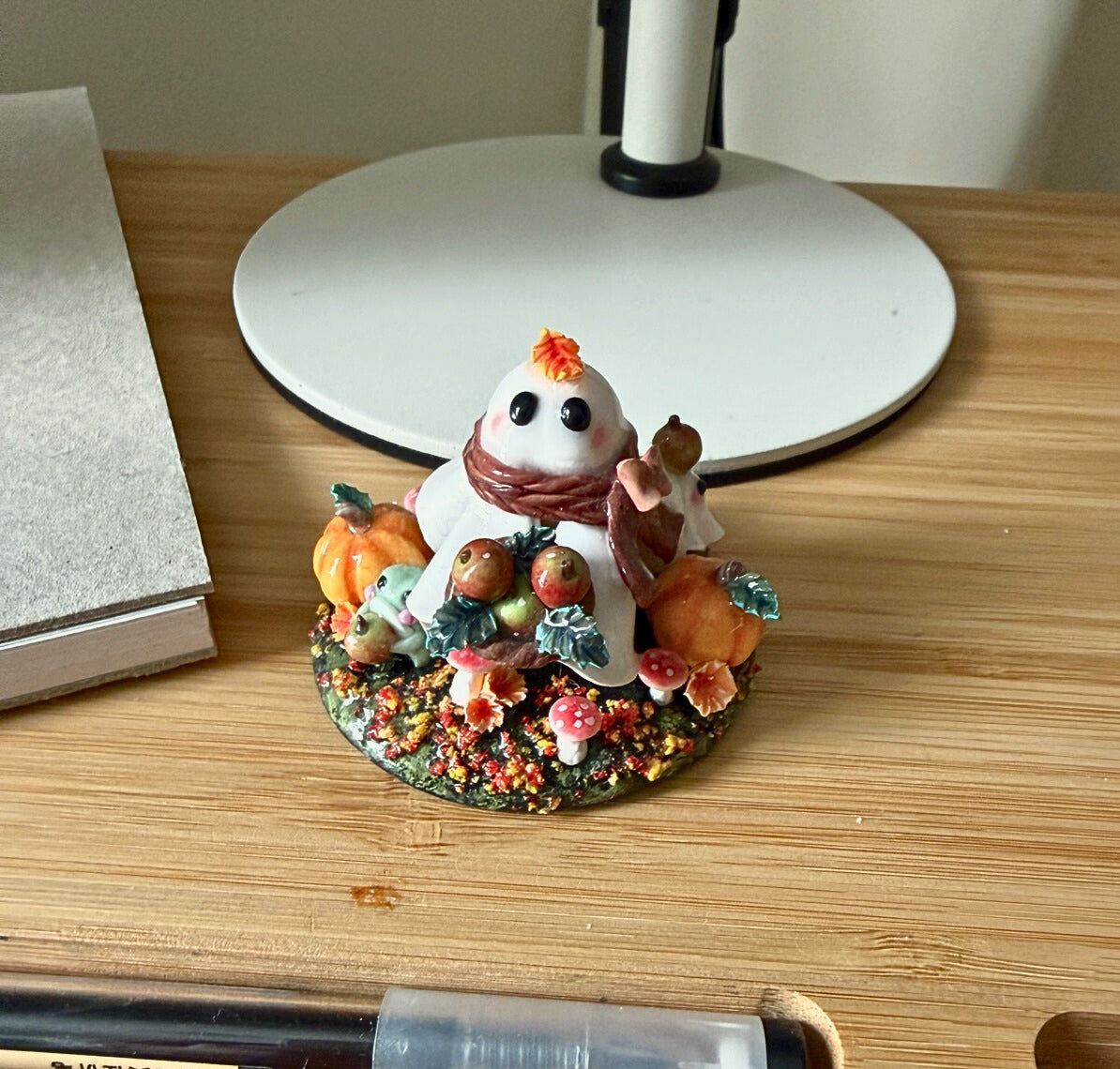 “I love my little omen so much! The craftsmanship is incredible. Even the smallest things are thoughtful: the dots on the toadstools, the texture on the pumpkins, the soft blush on the ghost’s cheeks, the twist of the scarf. It’s held up beautifully and continues to brighten my workspace.”-Amanda C.